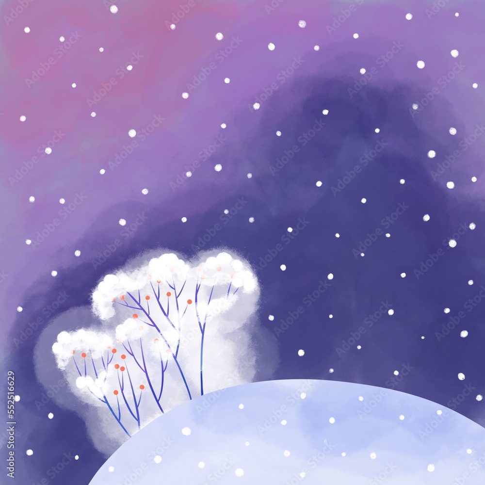 Winter landscape with snow. Colorful illustration. Background with empty copy space. Beautiful snow wallpaper. Christmas card design. New year flyer