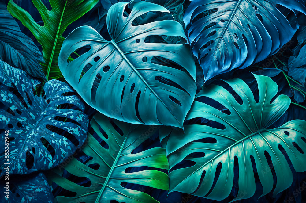 A monocolor collection of tropical leaves in different shades of blue, set against a blue background