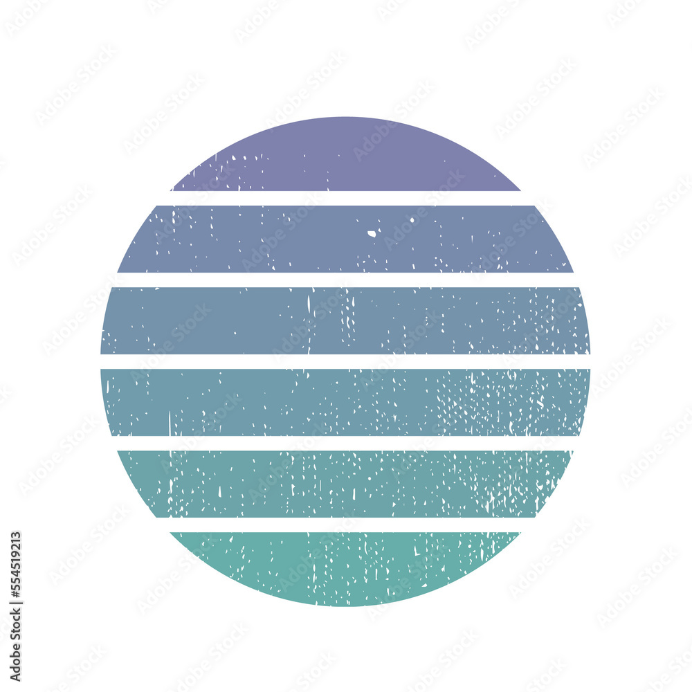 Vintage colorful sunset. Striped gradient sunrise badge in 80s and 90s style. Sun and ocean view, summer vibes, surfing. Design element for print, logo or t-shirt. Vector illustration
