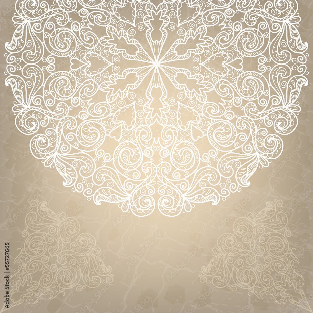 Beautiful wedding card with white lace round ornament on an Wallpaper