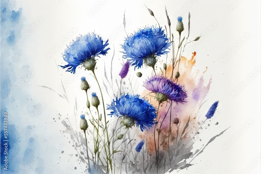 A Painting Of Blue Flowers With Watercolor Splashes Wallpaper Mural - Decorly Solutions | Decorly Solutions