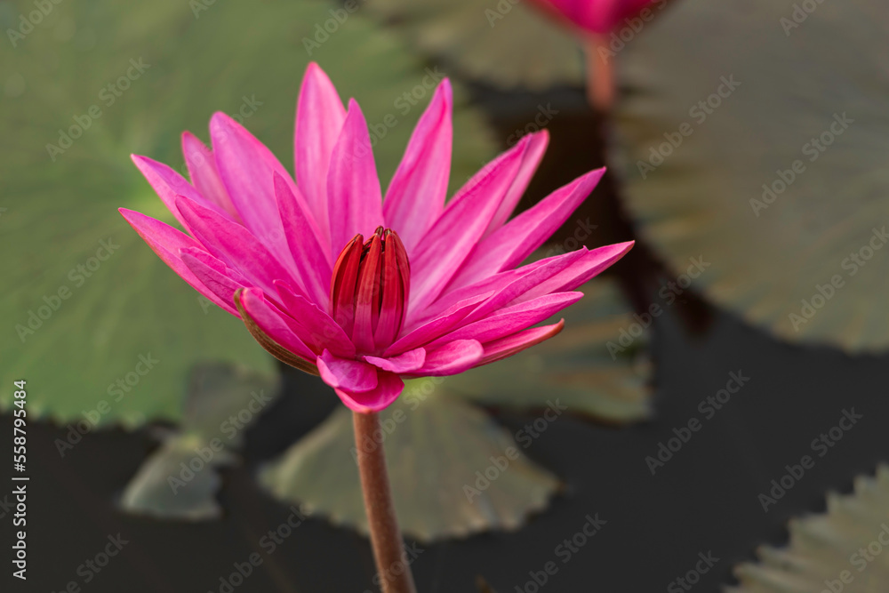 The lotus that emerges from the water. There are leaves on the surface of the water. The pink lotus flower blooms beautifully in the morning.