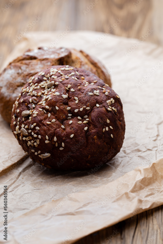 Assortment of baked bread on wooden table background.