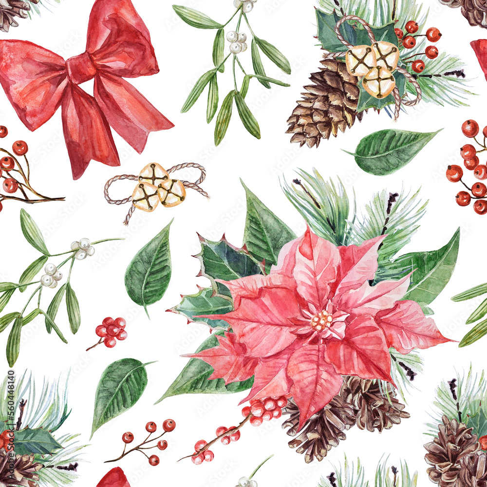 Watercolor hand-painted holiday seamless pattern. New Years`pattern with poinsettia flowers, holly, mistletoe and pine branches, and berries on a white background.