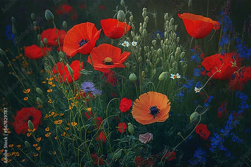a painting of a field of flowers with a dark sky in the background and a green field with purple, red, and blue flowers.  generative ai