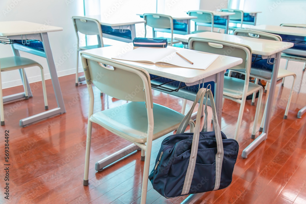 教室の机に吊り下げられたスクールバック。学校生活のイメージ、背景素材 Wallpaper Mural - Decorly Solutions | Decorly Solutions