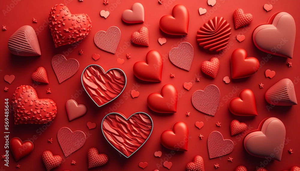 A flat lay style greeting composition displaying an array of red hearts is set against the backdrop of Valentine's Day.