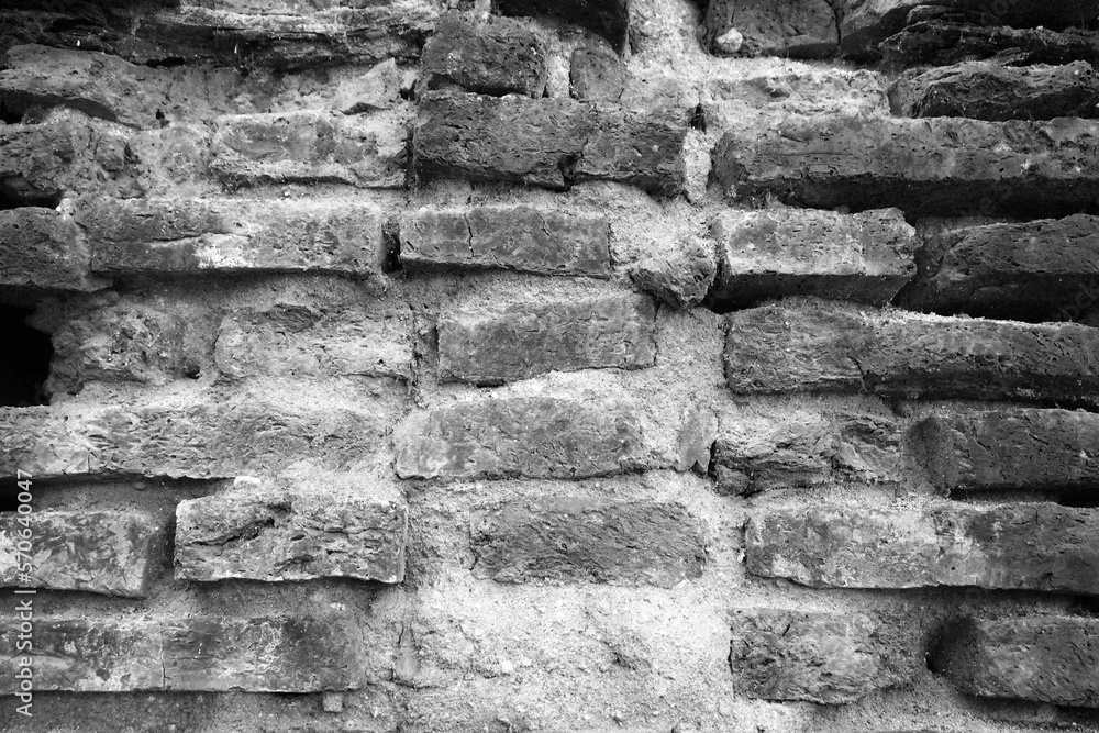 Monochrome texture of an old brick wall creates a striking background, showcasing the unique characteristics of an aged surface with a monochrome palette perfect for various designs.