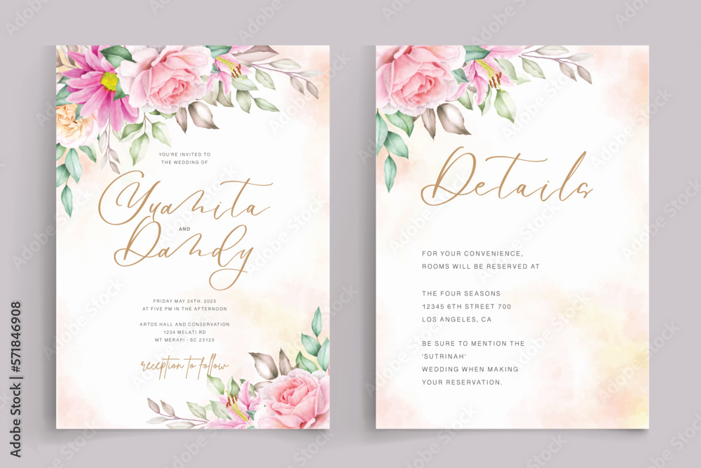 Minimalist wedding invitation set with watercolor rose flower and green leaf illustration