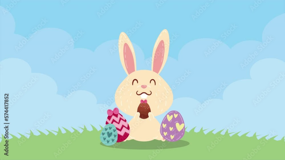 Happy Easter Animated Card With Rabbits Couple And Eggs Painted