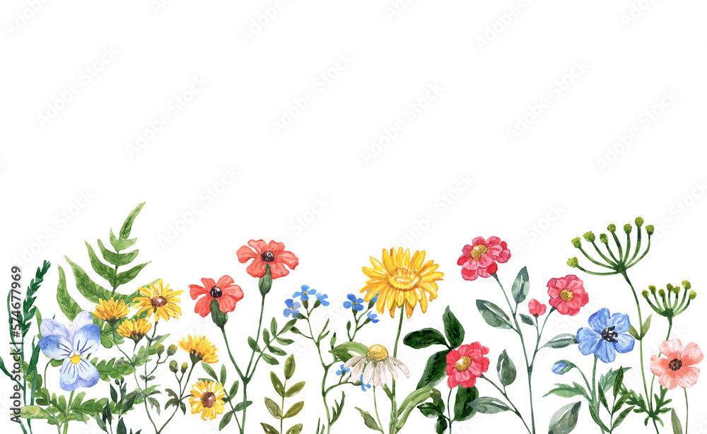 Horizontal border with field flowers isolated on white. Vector illustration. Summer flowers design.