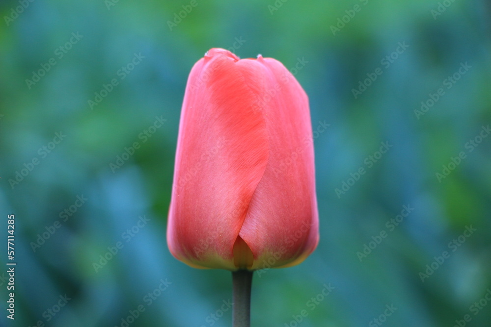Close Up Of One Single Red Tulip Bud With Blurry Green Background