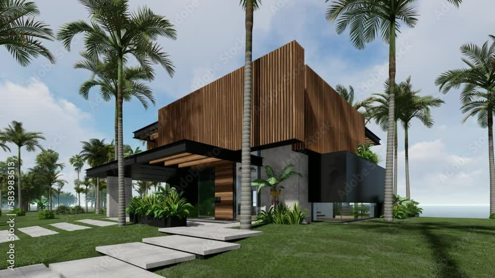 3d rendering of modern cozy house with parking and pool for sale or rent with wood plank facade by the sea or ocean. Sunny day by the azure coast with palm trees and flowers in tropical island