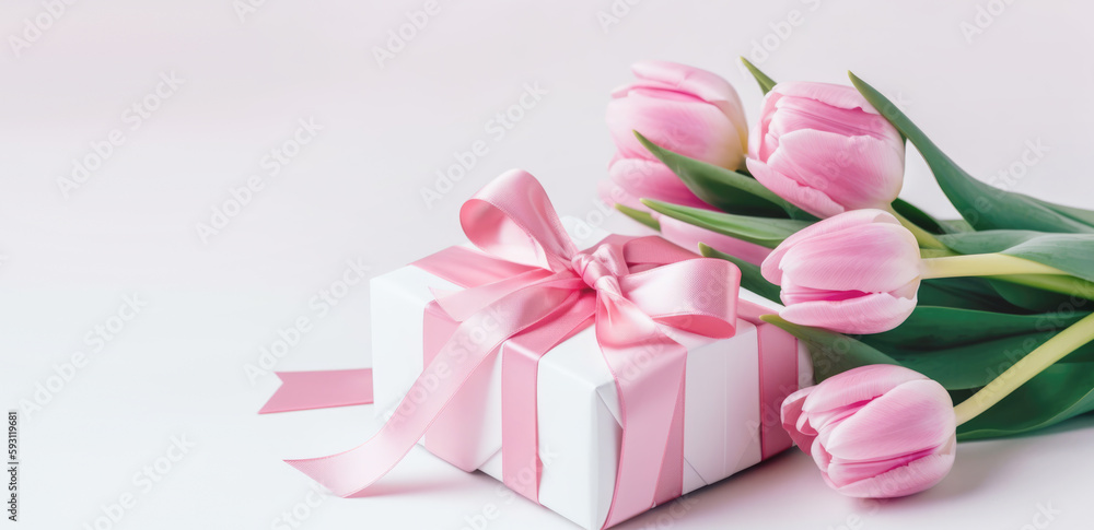 Mother's Day concept. Pink gift box with ribbon bow and a bouquet of tulips.
