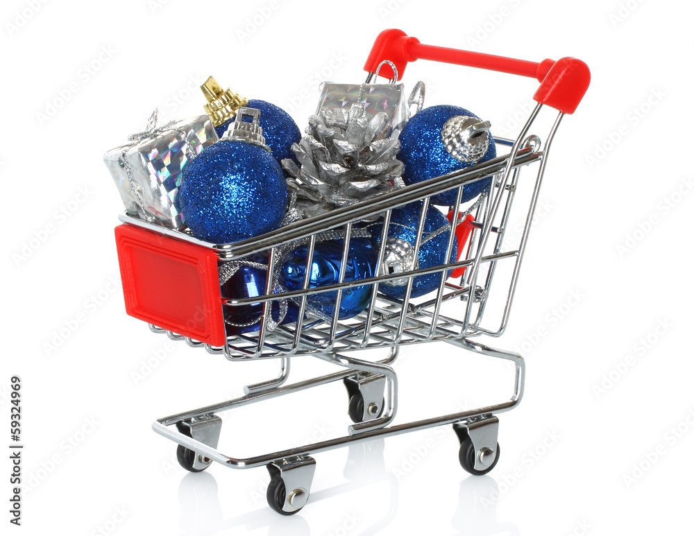 Shopping Cart Full Of Christmas Balls Isolated On White Backgrou