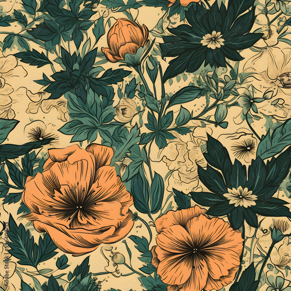 Seamless Vintage Retro Flower Pattern Ai Generative Illustration Wallpaper Mural - Decorly Solutions | Decorly Solutions