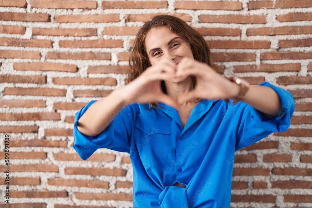 Beautiful brunette woman standing over bricks wall smiling i Wallpaper