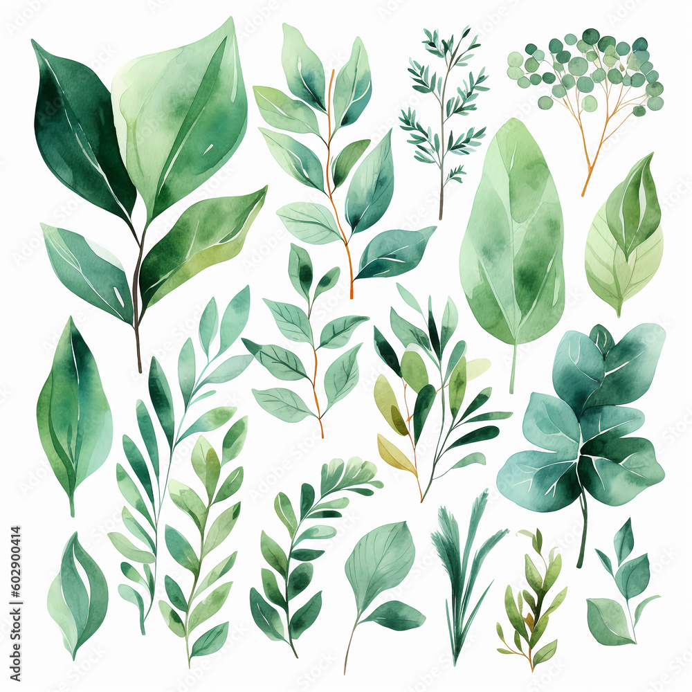 Artistic Watercolor Green Leaves Set Greenery Foliage And Wallpaper Mural - Decorly Solutions | Decorly Solutions
