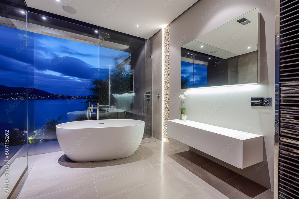Generative Ai Illustration Of Large Luxury Bathroom With Wallpaper Mural - Decorly Solutions | Decorly Solutions