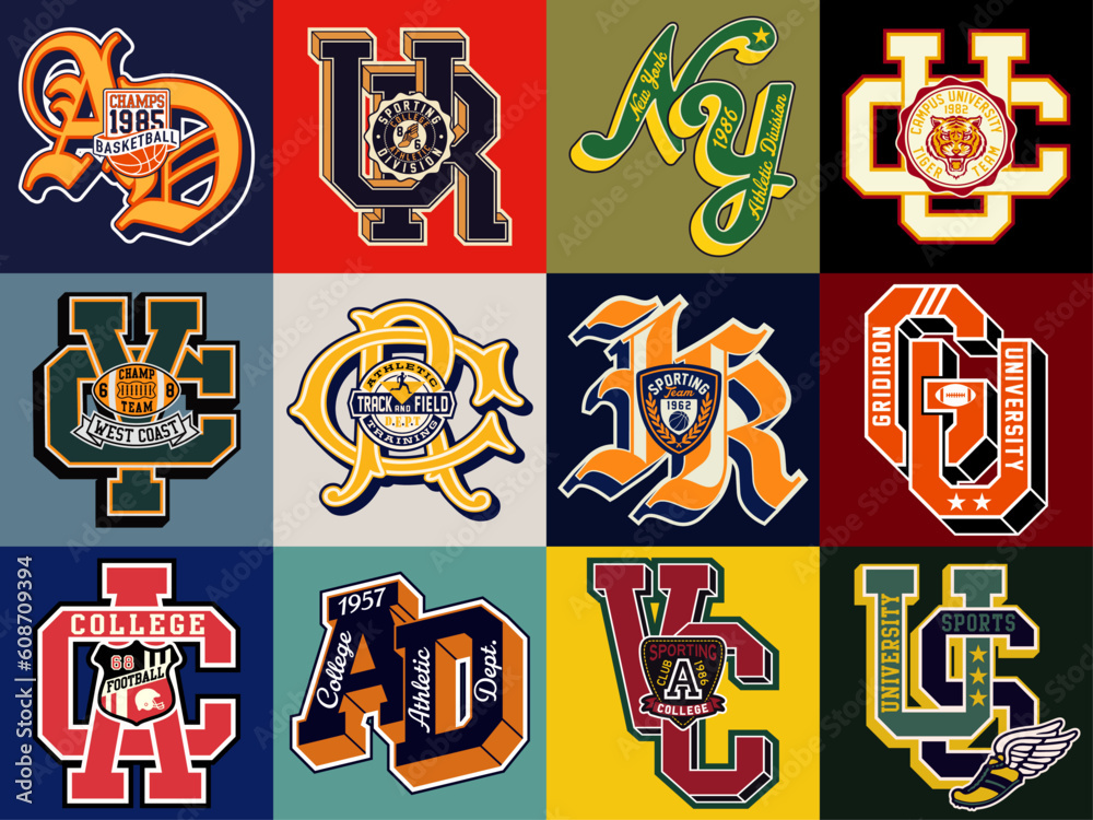 Varsity collegiate athletic letters font alphabet patches vintage vector artwork for sport print and embroidery collection