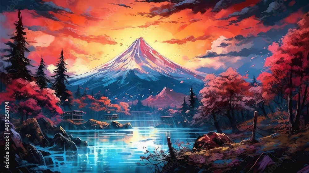 Mountain landscape at sunset beautifully painted with a vibr Wallpaper
