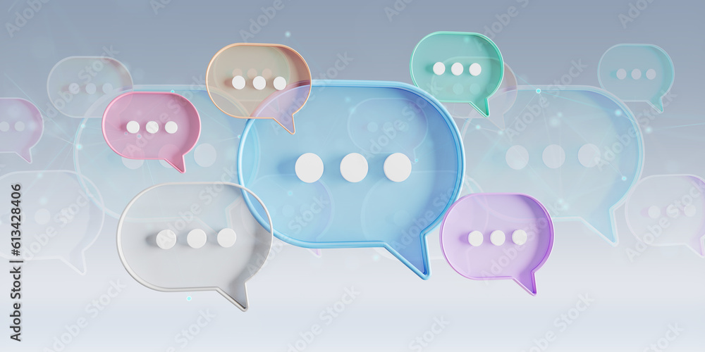 Minimalist blue red green and yellow speech bubbles talk icons floating over orange background. Modern conversation or social media messages with shadow. 3D rendering