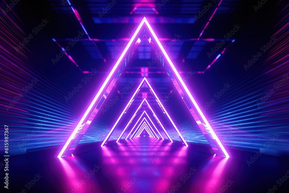 An abstract neon stage featuring glowing tetrahedrons suspended in mid-air, creating an otherworldly and surreal atmosphere. Abstract futuristic neon light background. Generative AI