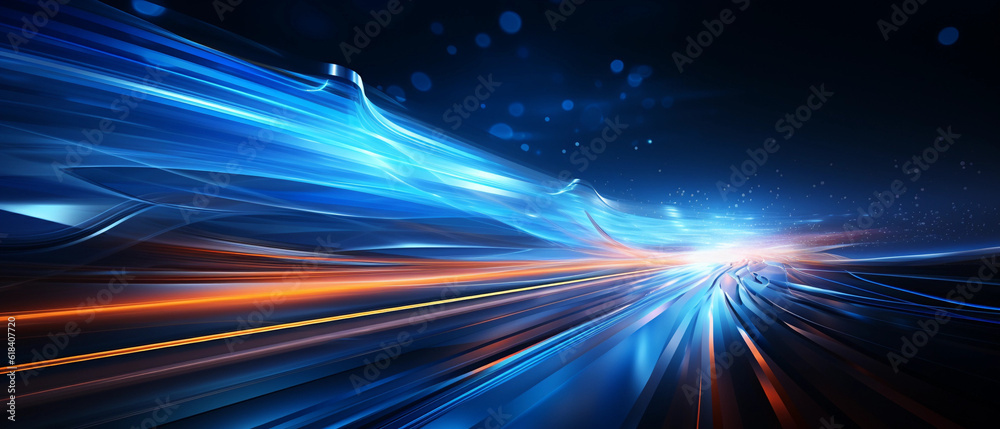 Nighttime Velocity: A Dynamic Illustration of Accelerating Motion on a Road, with Light Trails and Stripes Cutting Through the Darkness in Abstract Blue.