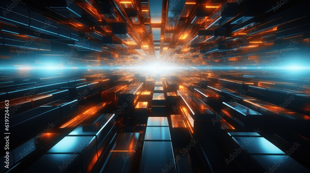 Abstract Digital Tunnel, Bright Center, Blue and Orange Bokeh, Graphic Design Element