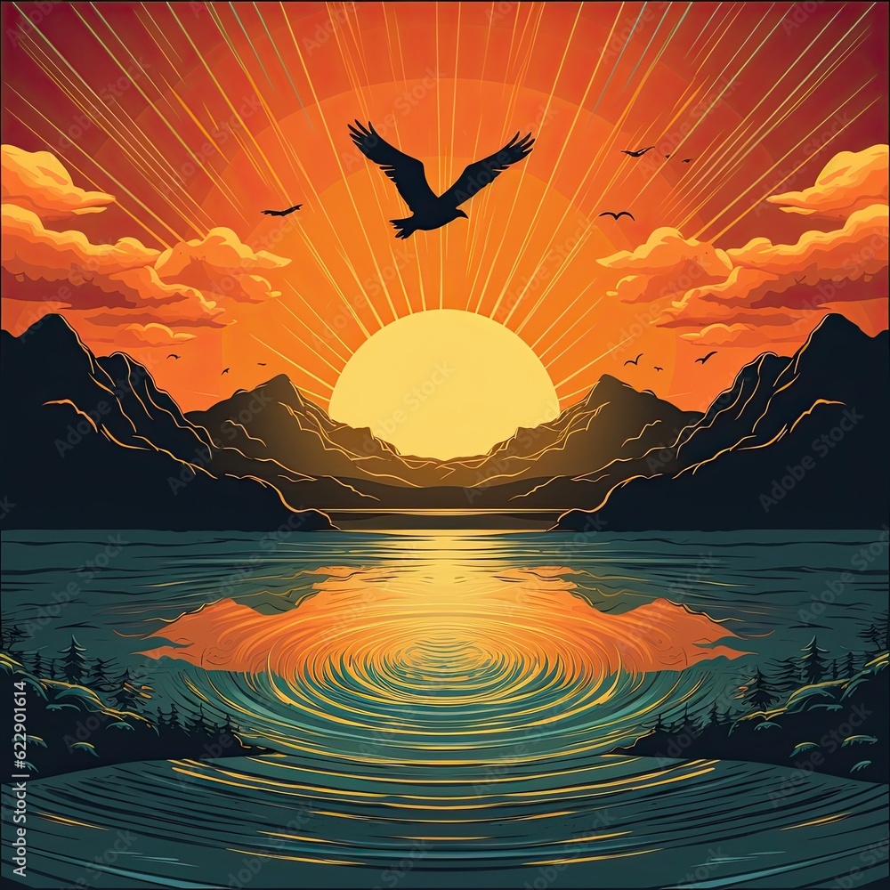 The painting displays a red sunset with trees, a pond, and a flying bird. (Generative AI)