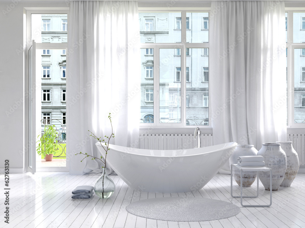 Sunny White Bathroom Interior With Separate Bathtub Wallpaper Mural - Decorly Solutions | Decorly Solutions