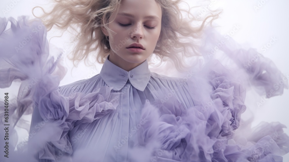 Art Of Elegance, Sophisticated Couture Displayed In A Liminal Lavender Space Under Dramatic Light, Generative Ai.
