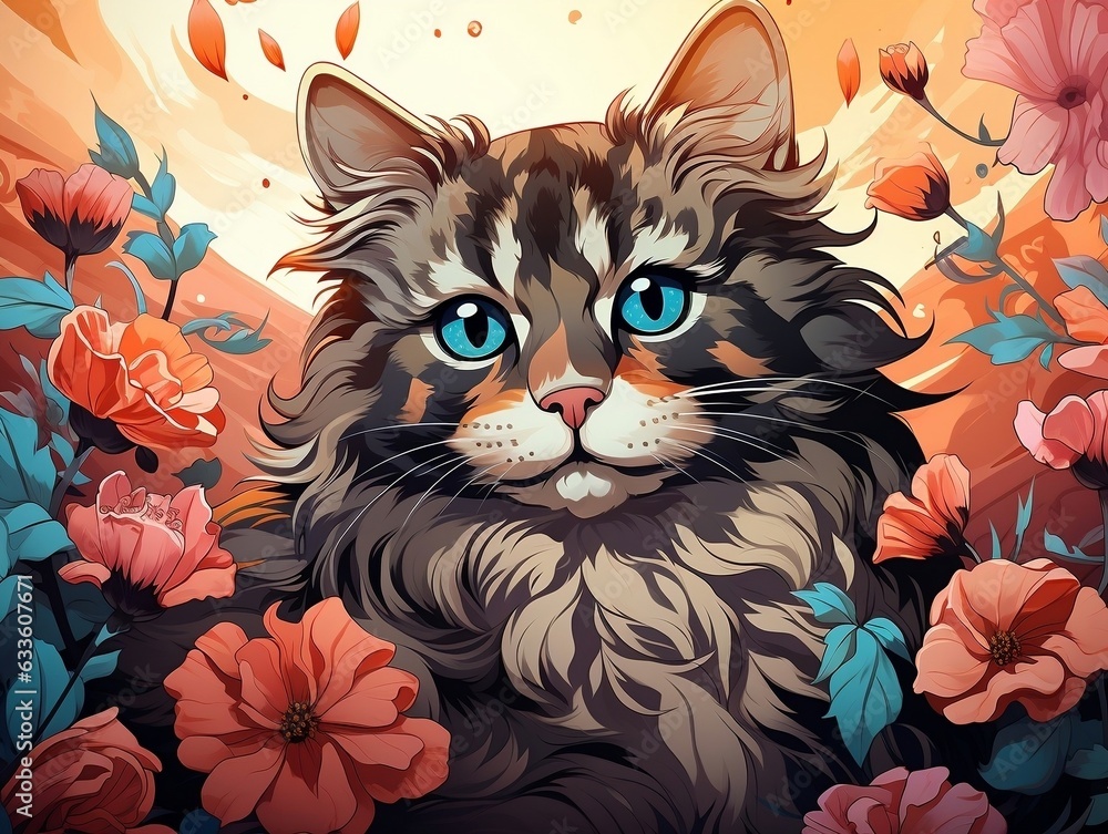 Watercolor Blue Point Ragdoll Cat With Flowers Around