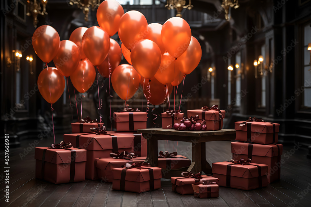 birthday party balloons, colourful balloons background and birthday gifts, cake with candles
