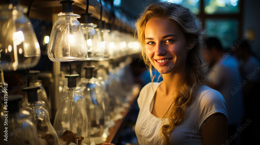 Intriguing contrast of a radiant, 18-year-old blonde with blue eyes and bright smile in white dress, set against an active science lab backdrop.