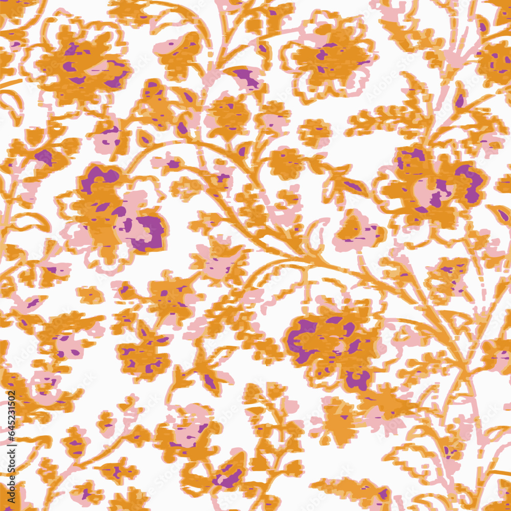 Purpoe and orange leaves seamless vector pattern. Botanical surface print design for fabrics, stationery, textiles, backgrounds, packaging, and gift wrap.