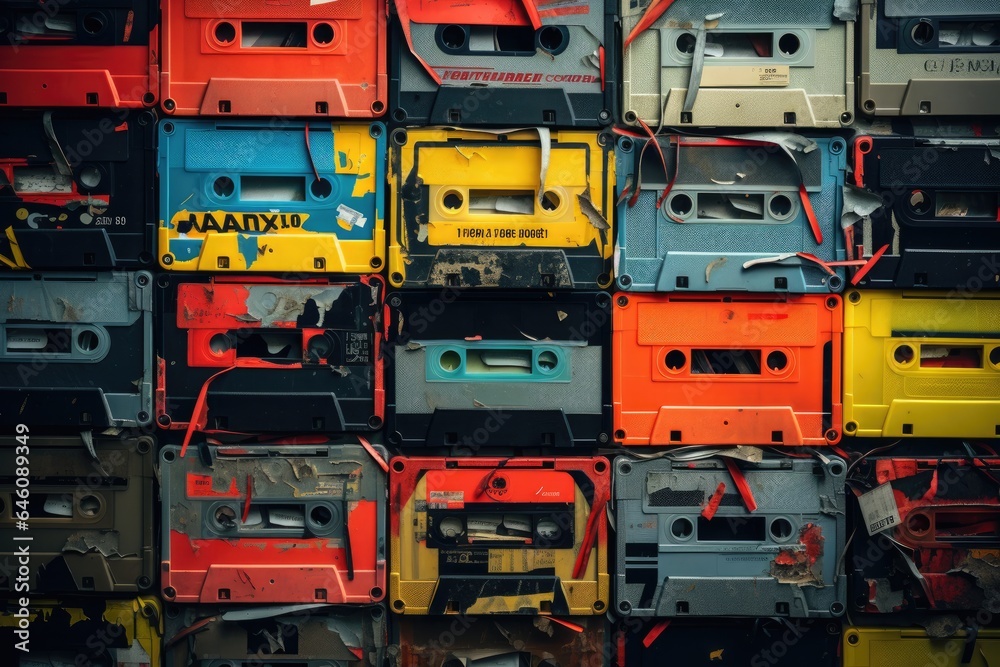 A collection of old cassette tapes. Generative AI.