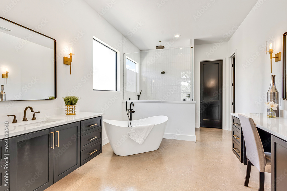 Elegant and modern bathroom interior design with natural light and wooden vanity