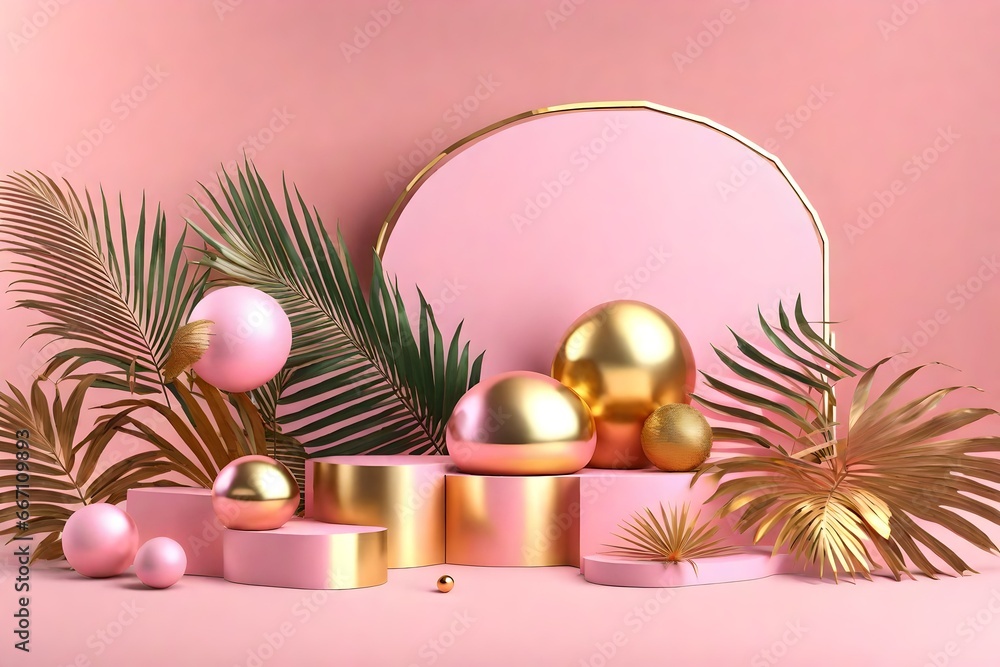 Christmas-themed Display With Pink Podium, Pine Branches, Golden Ornaments, And Pine Cones For Festive Decoration