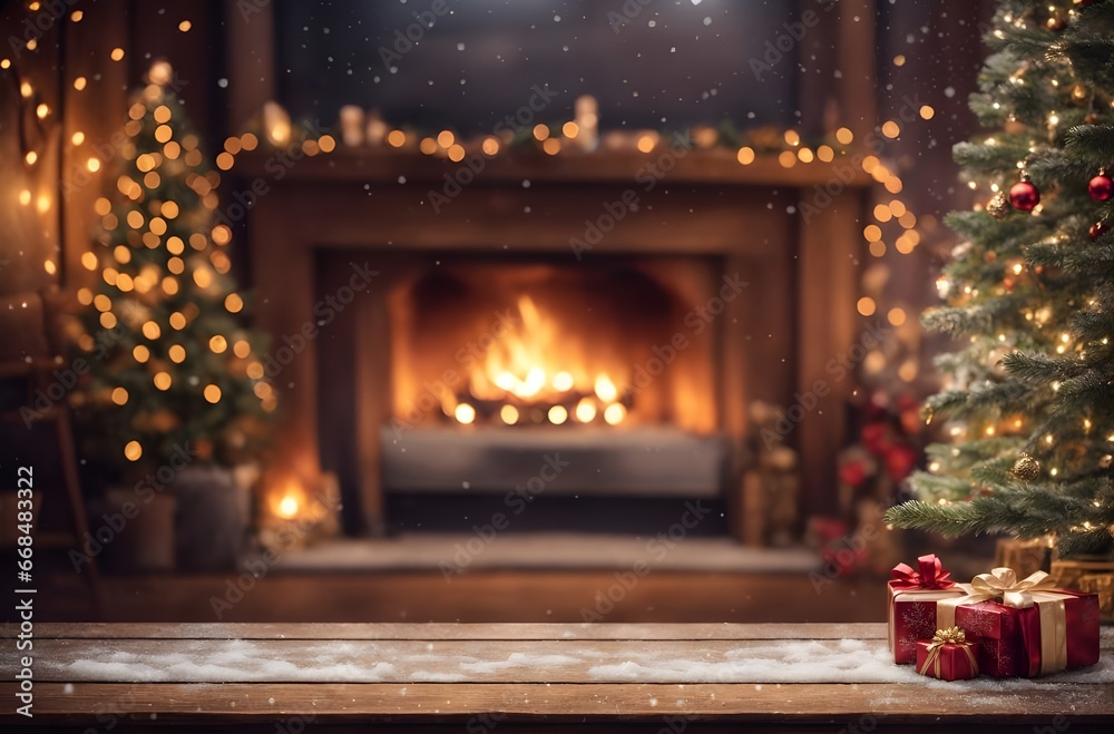 Elegant Wooden Surface Near Decorated Tree And Cozy Fire, Festive Holiday Setup With Blank Wooden Board For Product Display