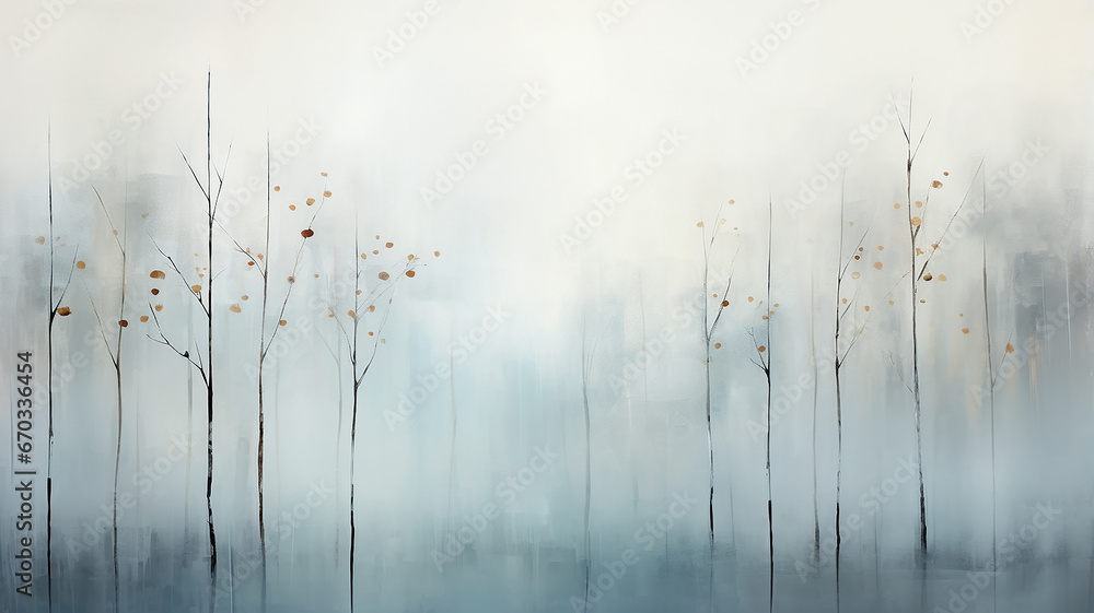 light white blue fog, a row of trees. watercolor abstract background late autumn, symbol landscape view cold light November, copy space blank blank