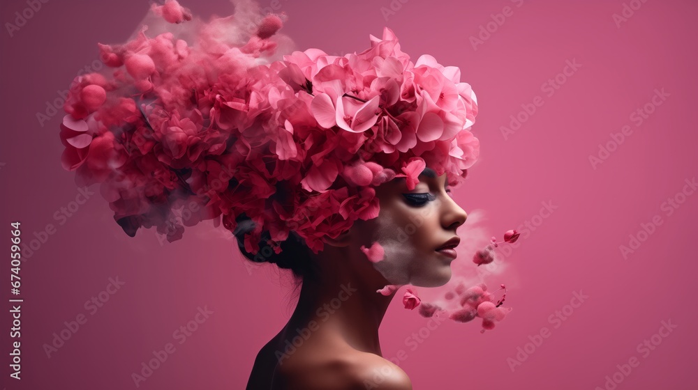 Stylish Cosmetics Concept Background. Beautiful Pink and Purple Blooms Surround a Beautiful Woman.