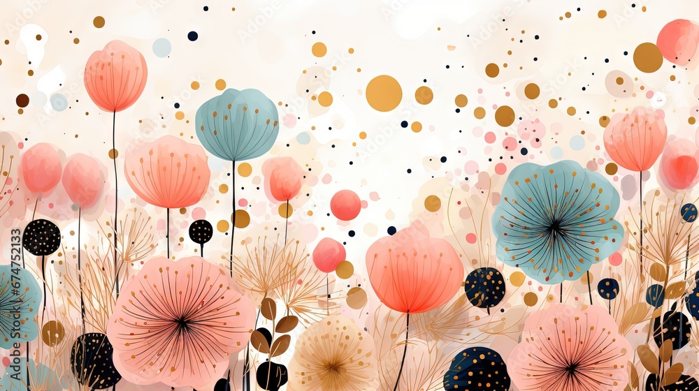 Pois multicolores et dorés, terrazzo, doodle, tampons et superpositions numériques florales, rayé, palette de couleurs audacieuses, emblématique, géométrique. IA générative, IA