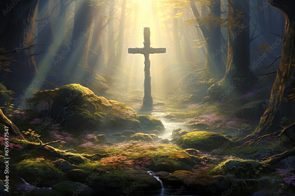 Wooden cross in the forest with sunlight in the morning Wallpaper