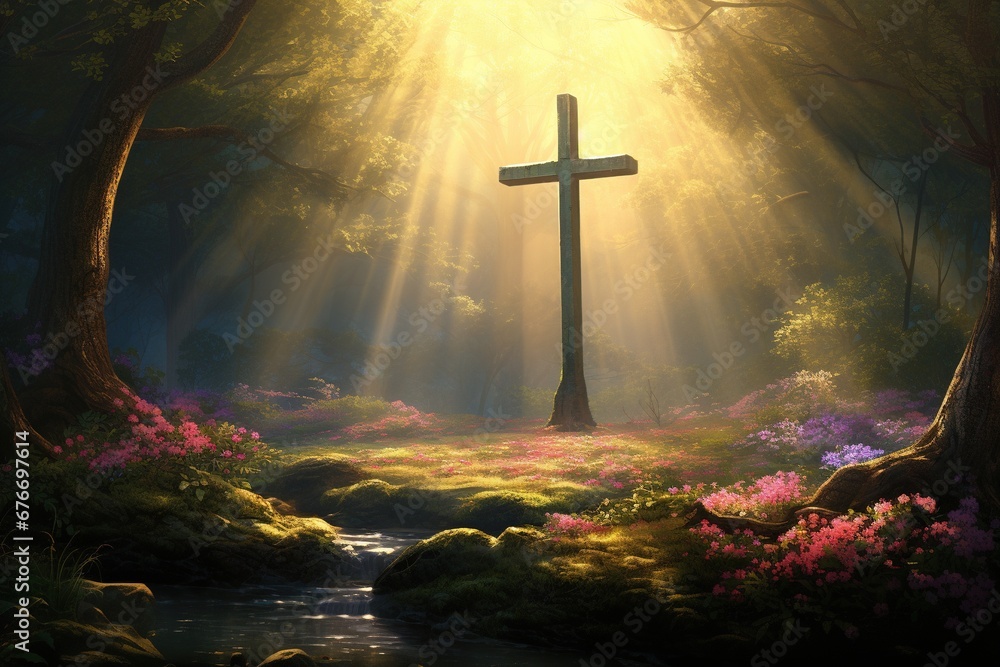Wooden Cross In The Forest With Sunlight In Wallpaper Mural - Decorly Solutions | Decorly Solutions