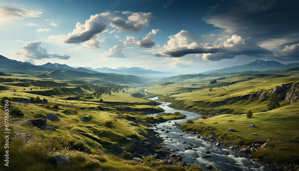 Mountain landscape with green meadow blue sky and sunset gen Wallpaper