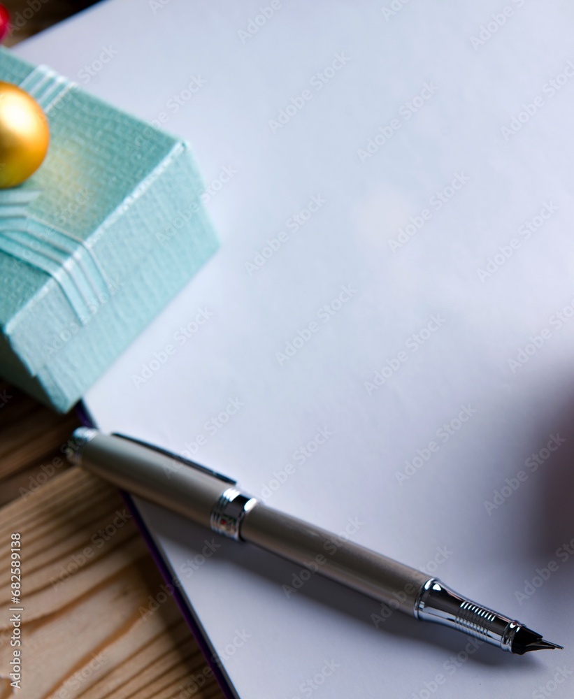 Blue Pen Rests On A Blank Notebook. Wood Grain Visible