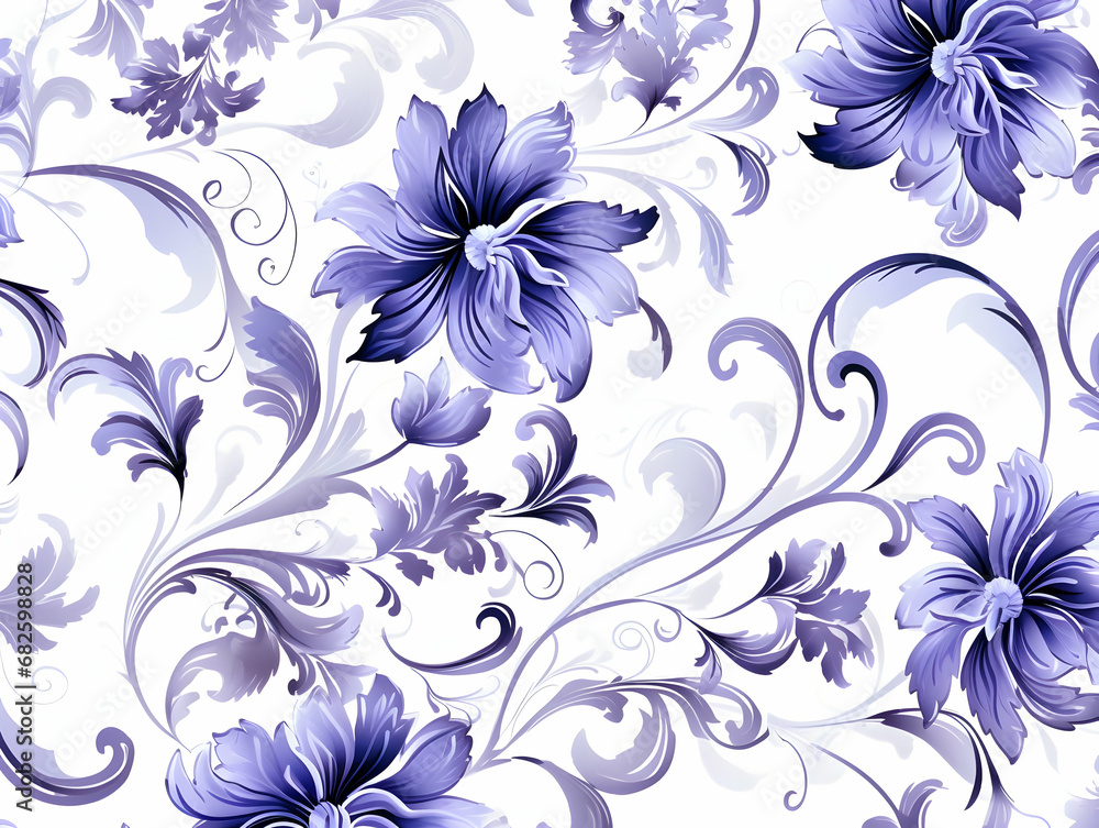 Blue and white porcelain pattern, featuring floral and leaf motifs ,A traditional hand-painted seamless pattern featuring the classic Dutch Delft blue and white color scheme.