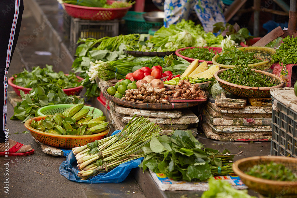 A local Thai market selling fresh vegetables, herbs, and spices, full of rich aromas