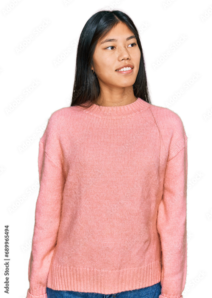 Young Asian Woman Wearing Casual Winter Sweater Looking Away To Side With Smile On Face, Natural Expression. Laughing Confident.